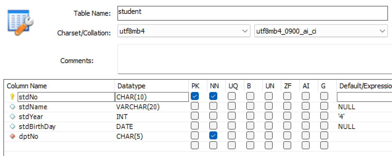 # department ์ primary key ์ธ dptNo ์ student ํ
