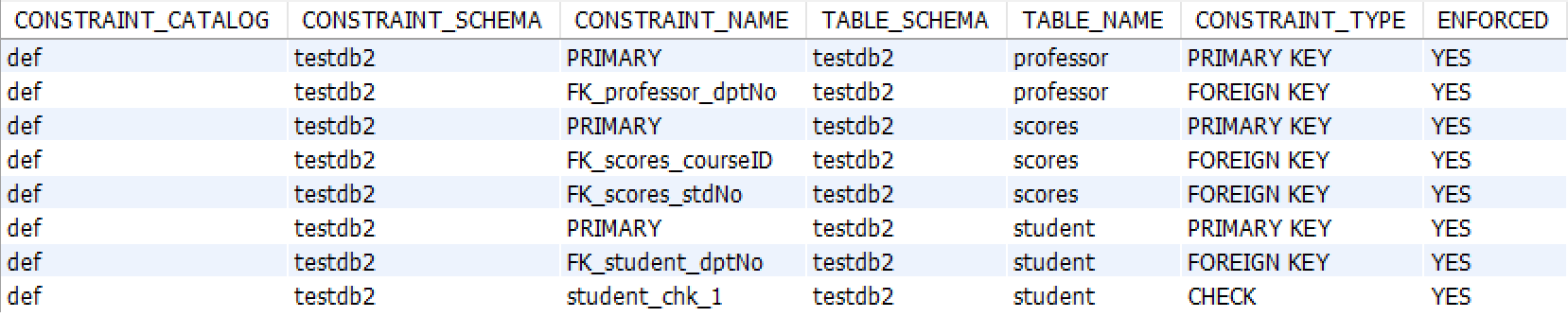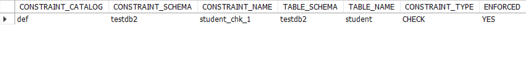 WHERE CONSTRAINT_SCHEMA='testdb2' AND TABLE_NAME='student'