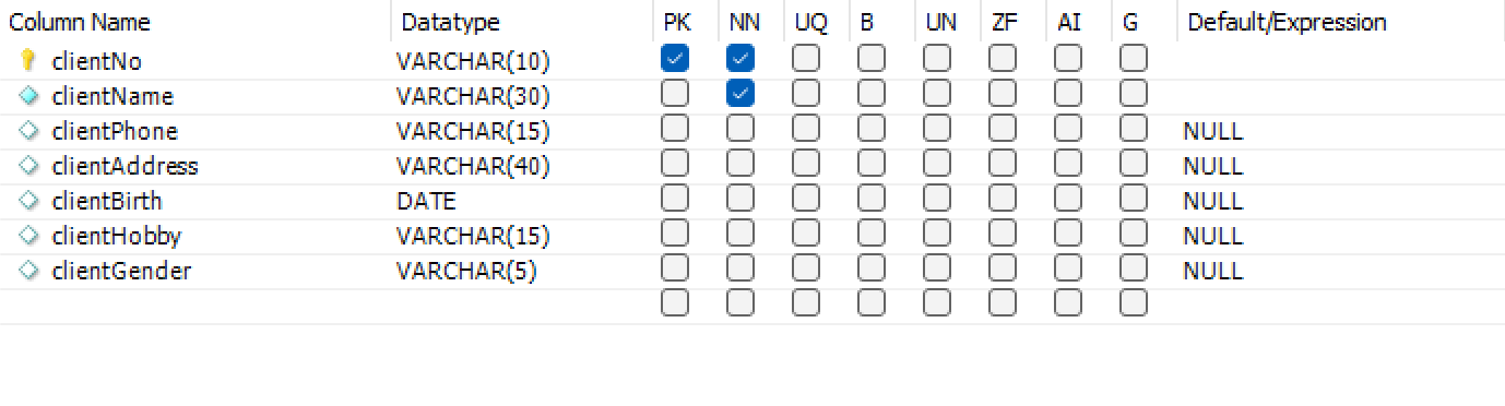 clientNo VARCHAR(10) NOT NULL PRIMARY KEY,