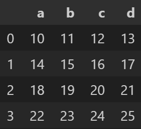 df2 = pd.DataFrame(data=np.arange(10, 26).reshape(4, 4),