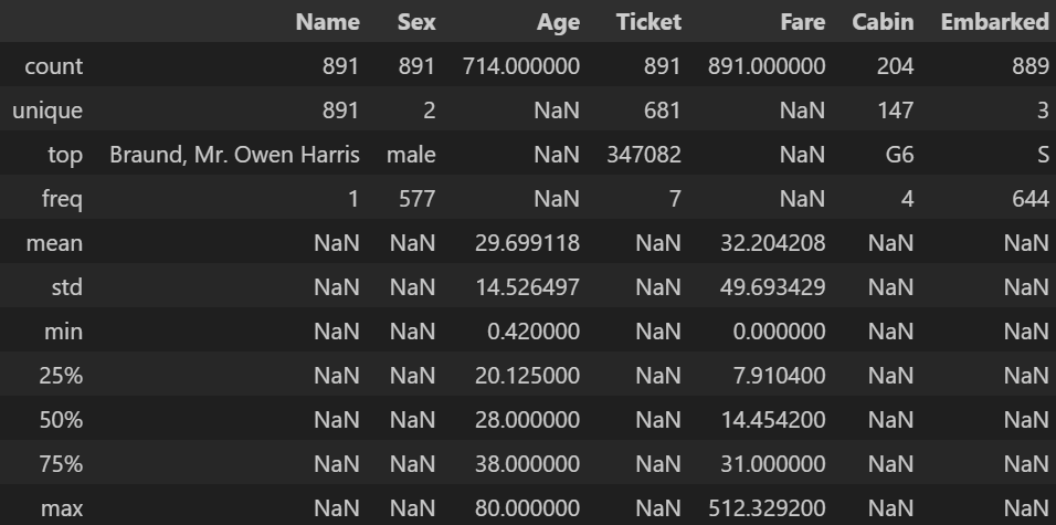 describe() 는 수치형 데이터의 기술통계를 출력하지만, include='all' 을 하면 수치형이 아닌 데이터도 포함시킨다.df_tit.describe(include='all')