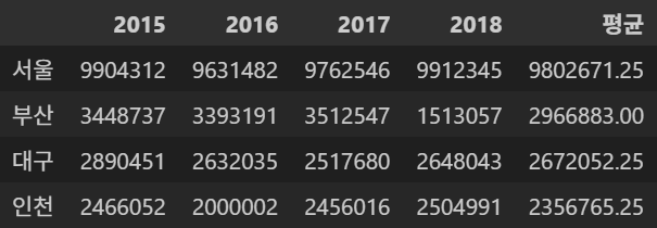 평균 컬럼이 생성된 것을 확인할 수 있다.df['평균'] = (df['2015'] + df['2016'] + df['2017'] + df['2018']) / 4
