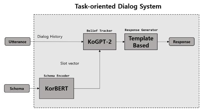Schema Encoder: 한국어로 사전학습된 KorBERT 사용, 각 슬롯 별 설명을 인코딩하여 Belief Tracker에게 제공, 시나리오 기반 대화를 하지만 비슷한 시나리오가 추가되거나 변경에 쉽게 대응하기 위해 도입