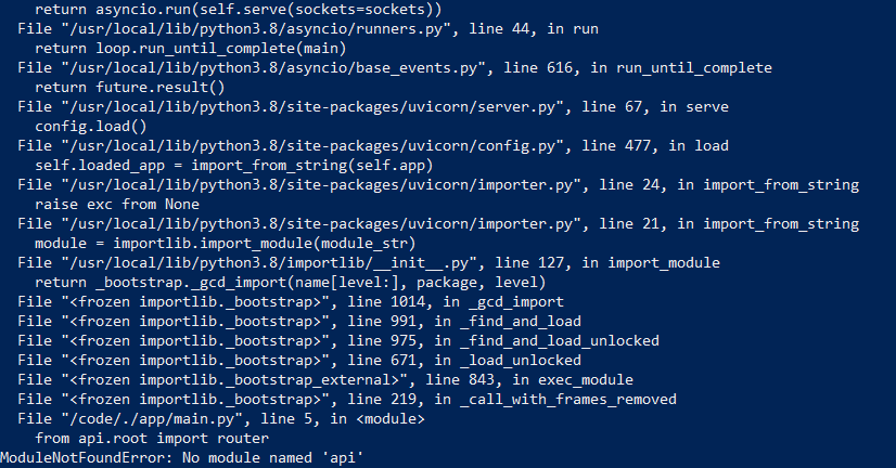 dockerfile의 작업 디렉토리 위치가 훨씬 상단에 위치하여 api.root로 접근할 수 없었던 문제였다. 작업디렉토리 시작위치를 명시해주니 잘 동작했다.
