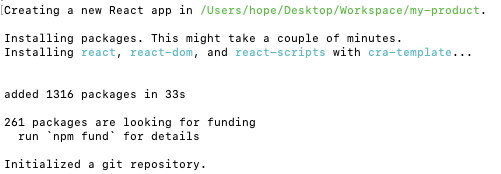 react, react-dom, react-scripts, cra-template을 설치하고 1316개의 패키지가 자동으로 같이 추가되었다.