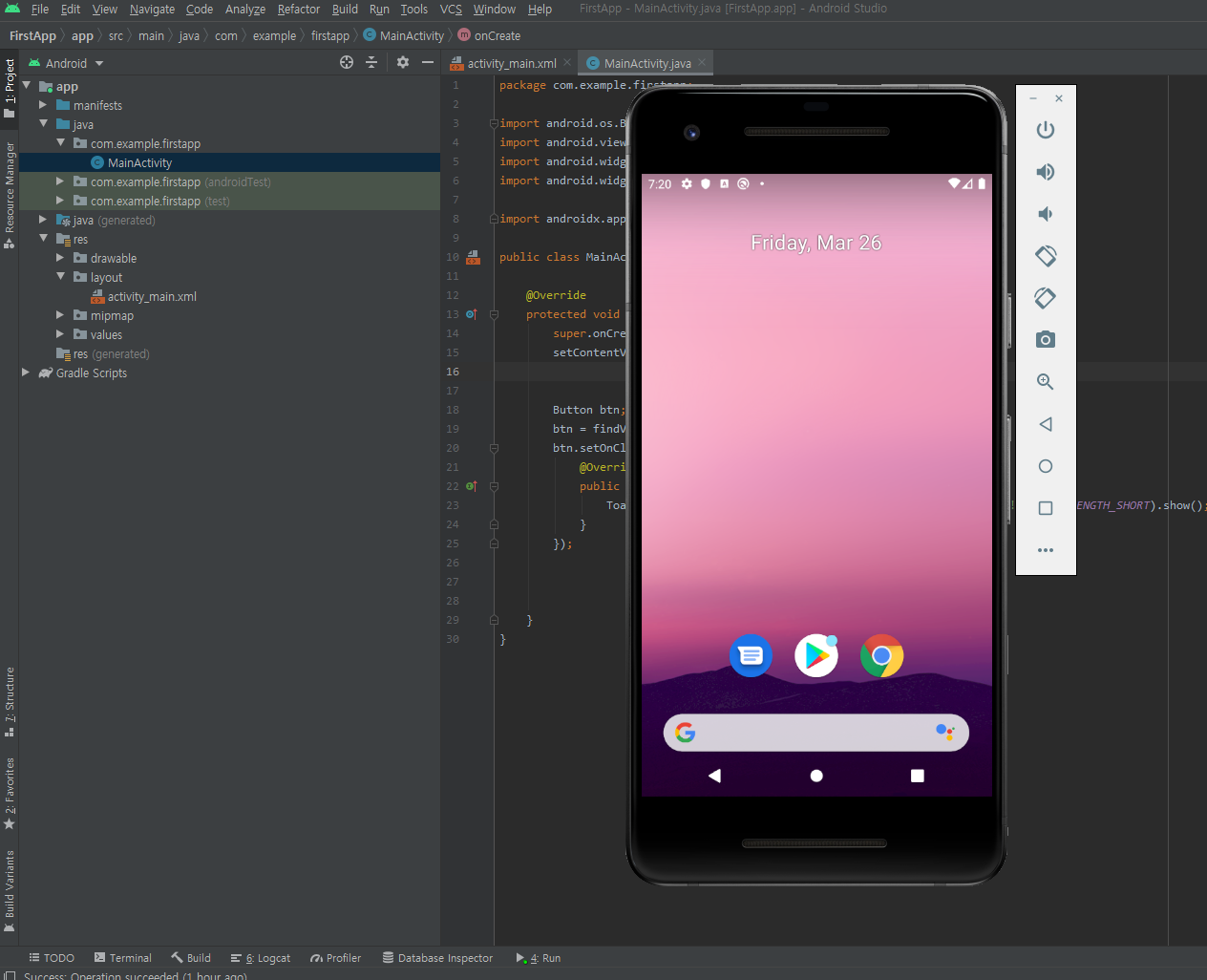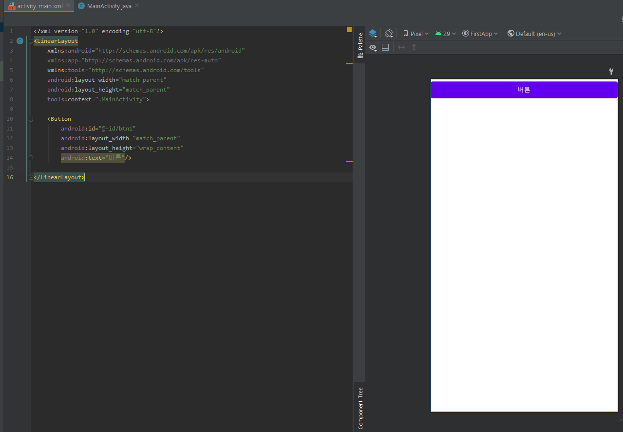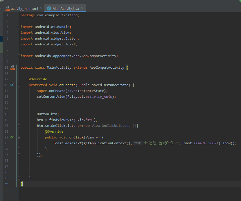 버튼눌렀을경우 액션일어나게 java사용하여 코드작성(코틀린 아직모름...)