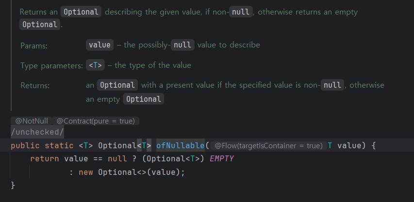 ofNullable은 null이면 그냥 EmptyList를 반환하는 방식이다. 매개변수로 null을 받는다.