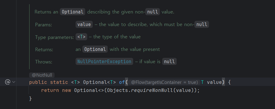 of는 null체크를 해서 null이면 NPE 예외를 던진다.