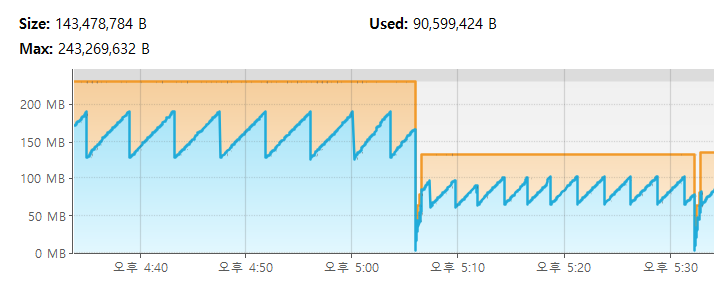메모리가 처음에는 100mb선이었다가, 이제 150mb선으로 넘어갔다.