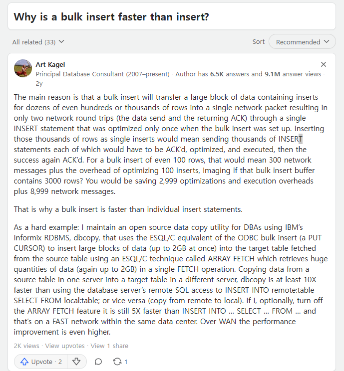 BulkInsert 방식을 쓰면 쿼리를 묶어서 보내기 때문에 그만큼 DB에 쿼리를 보내는 횟수가 줄어들게 된다. DB로 쿼리를 보내는 네트워크 전송 횟수 자체가 크게 줄어든다.