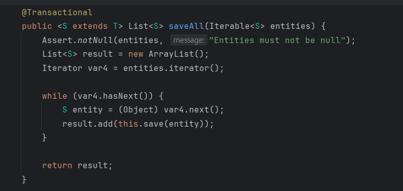 saveAll의 내부를 보면 결국 for문을 돌려서 하나씩 save하는 구조였다.