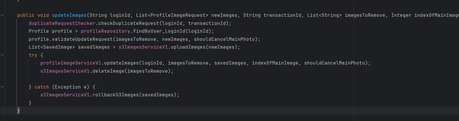 여길 보면 Try catch로 예외를 잡고, S3 롤백을 하는 코드가 있다.