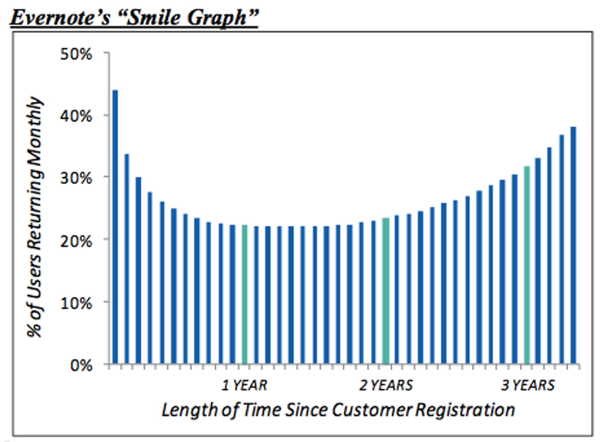 시간이 지날수록 유저에게 서비스 가치가 높아지는 제품들은 이것이 가능하다고 한다. 그 예로 에버노트의 Smile Curve가 있다.