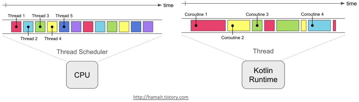 코루틴은 쓰레드가 아닌 쓰레드 내 동작하는 하나의 작업 단위이며 정의된 다양한 구성요소의 집합인 Context를 오버라이드 하며 실행된다. 따라서 쓰레드 내 Context Switching 없이 여러 코루틴을 실행 중단, 재개하는 상호작용을 통해 병행성을 갖기에 쓰레드와 메모리 사용이 줄어들고 개발자가 직접 작업을 스케줄링 할 수 있도록 한다.