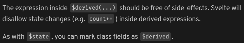 ($derived() 안에있는 식은(count++ 같은) 상태 변화를 유발하지 않음)