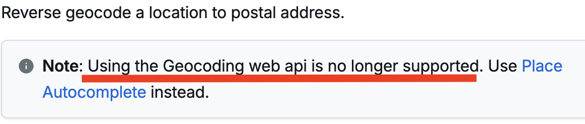 Geocoding web api를 더 이상 지원하지 않는단다;; 좀 제대로 읽어볼 걸.. Place Autocomplete를 대신 쓰라는데 일단 들어가봄