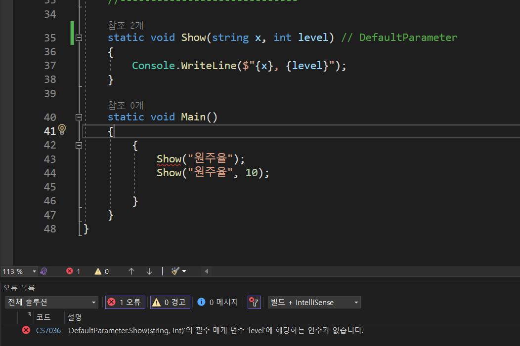 만약, static void Show(string x, int level = 1)에서 level = 1의 값이 없었다면, 컴파일 오류가 뜬다.
