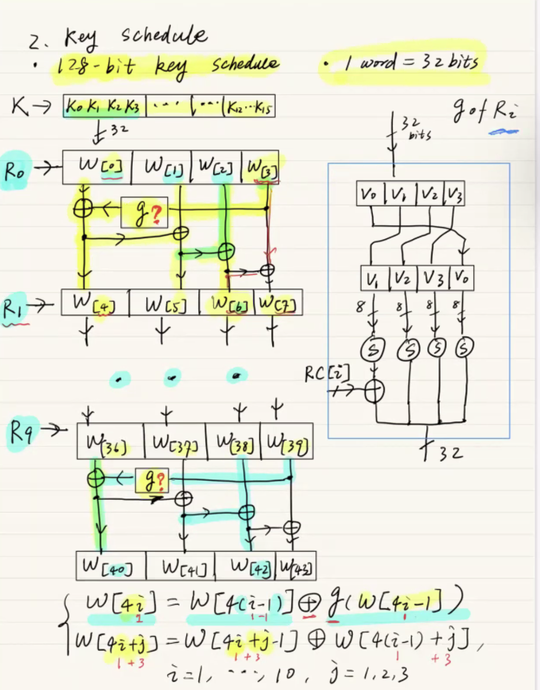 - 초기 128비트 마스터 키 K는 4개의 워드 W[0],W[1],W[2],W[3]으로 나뉩니다. 이것이 필기 상단의 R0 (Round 0) 키가 됩니다.