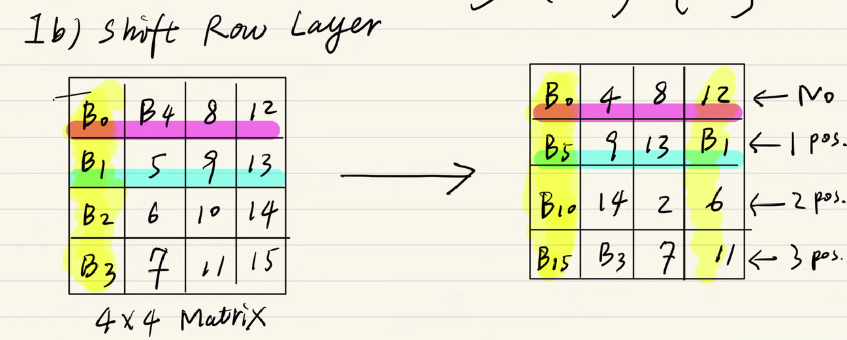 (2) Shift Row: 행 단위로 위치 이동 (Diffusion, 단순 섞기)
