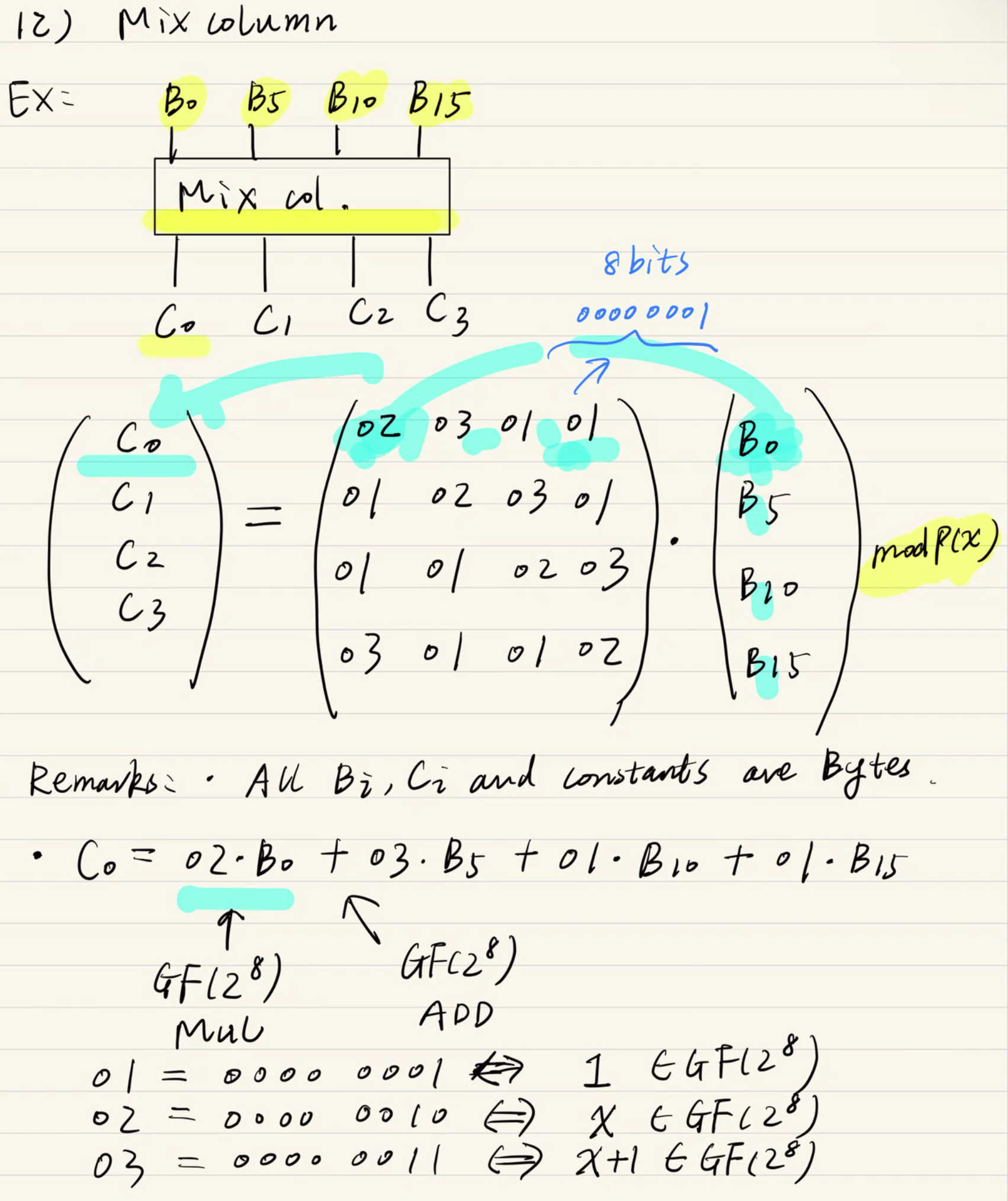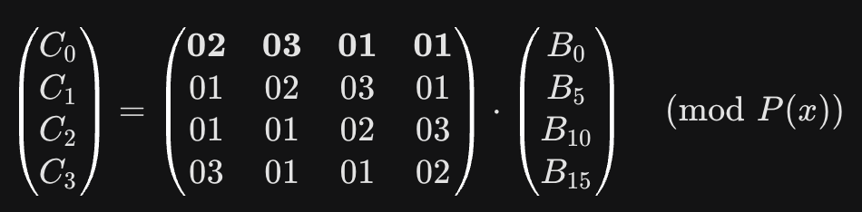 - 동작: 이 4개의 바이트를 통째로 가져와서, 특정한 행렬과 곱셈을 수행하여 새로운 값 C0,C1,C2,C3를 만들어냅니다.