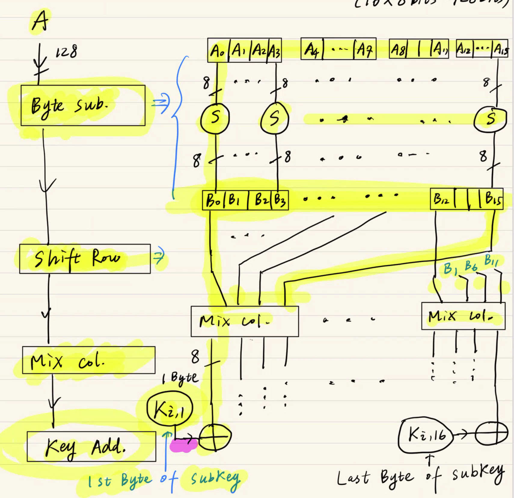 그림 위치: Mix col. 박스들. 4개의 바이트(B0∼B3)가 한 묶음으로 들어가는 것 보이시죠?