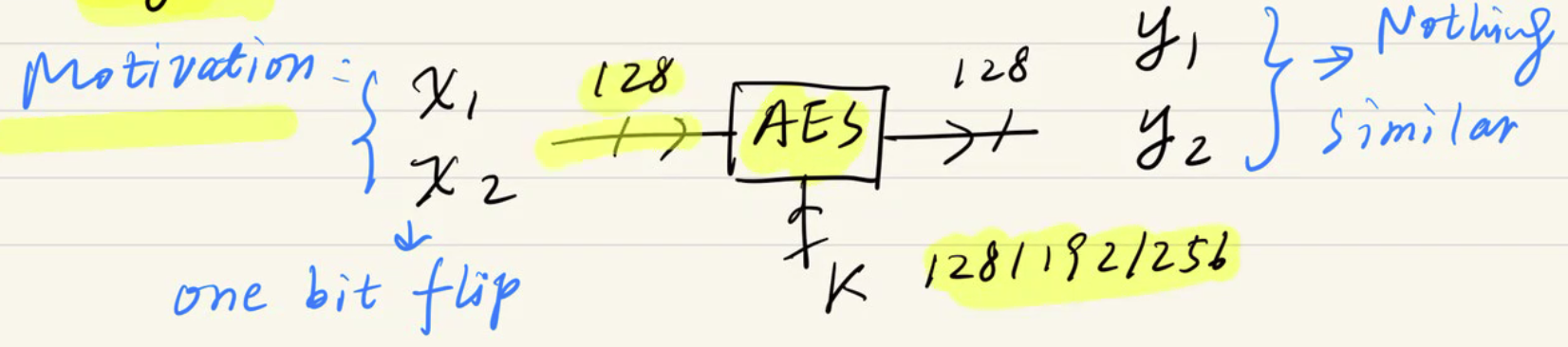 - 그림에서 입력값 X1과 X2가 단 1비트(one bit flip)만 달라도, AES 박스를 통과한 출력값 Y1과 Y2는 완전히 다른 값(Nothing similar)이 됩니다.