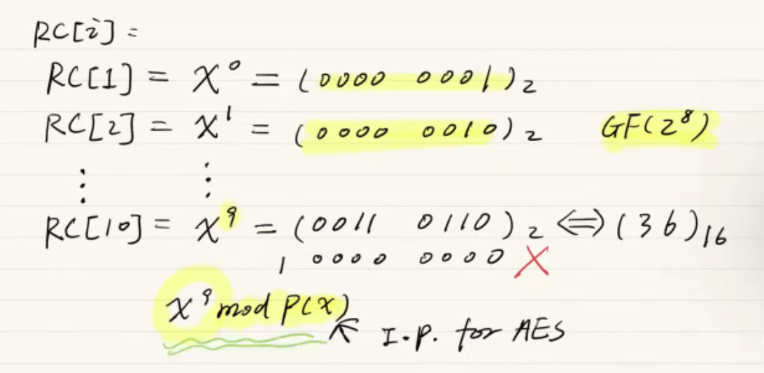 두 번째 필기는 g 함수에서 더해지는 RC[i] 값이 어떻게 도출되는지 보여줍니다. 이 값은 갈루아 필드 GF(28) 위에서 xi−1을 계산한 결과입니다.