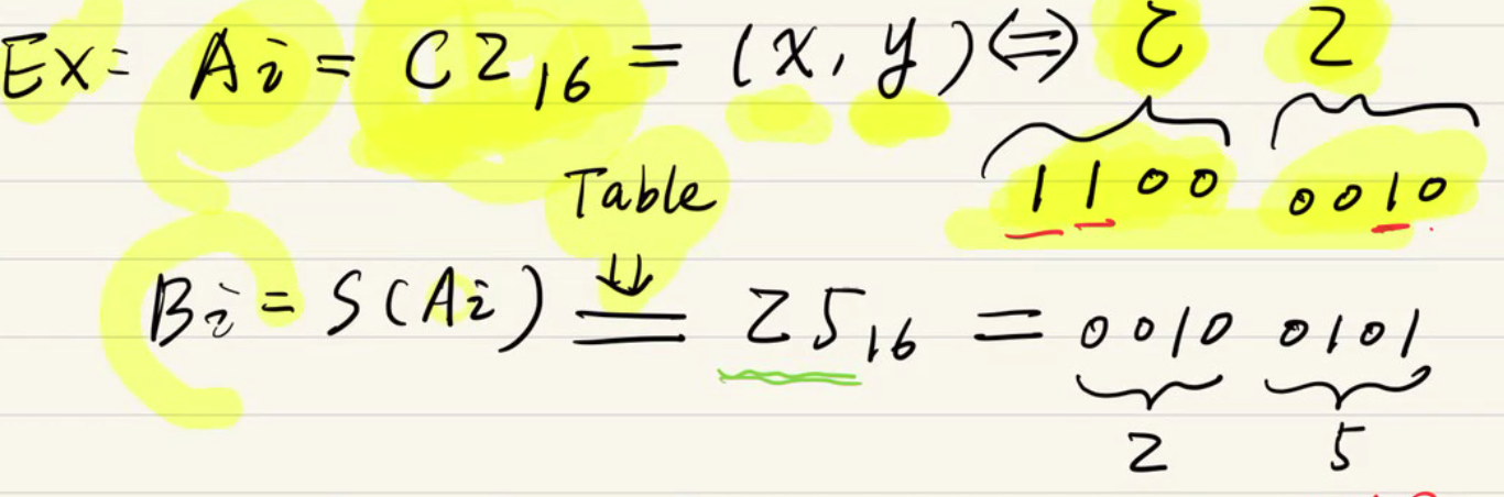 상황: 입력값 Ai가 16진수로 C2 (1100 0010)라고 가정합시다.\행동: 미리 만들어진 S-Box Table을 참조합니다.앞자리 C를 행(Row), 뒷자리 2를 열(Column)로 찾습니다.