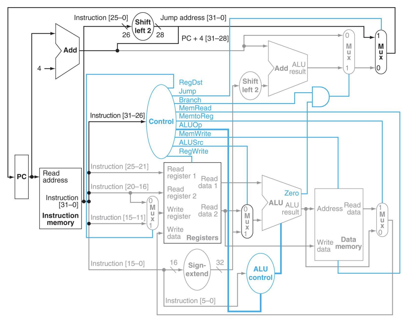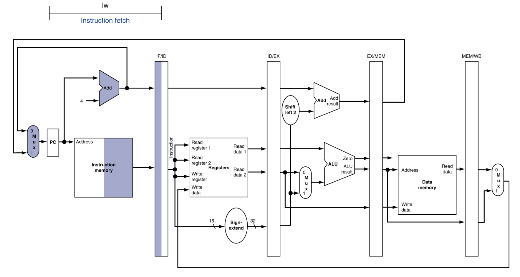 - Mux(멀티플렉서)의 존재: 만약 이전 명령어 중에 Branch(분기) 명령이 있었다면, PC + 4가 아닌 '점프할 주소'를 선택해서 PC에 넣어야 합니다.