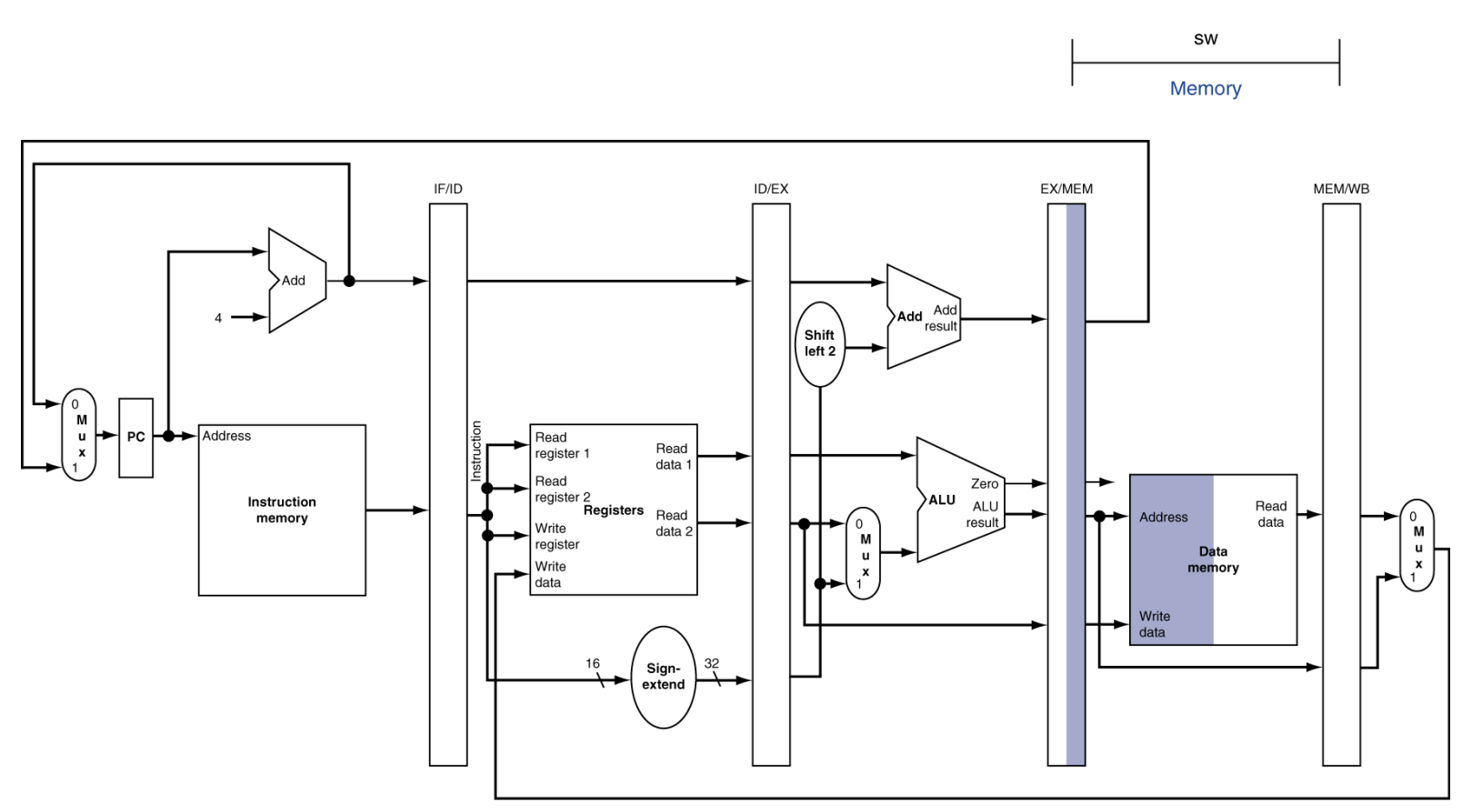 메모리에 실제로 저장할 데이터인 R1을 읽어서 메모리 단계(MEM)로 전달해야 합니다.