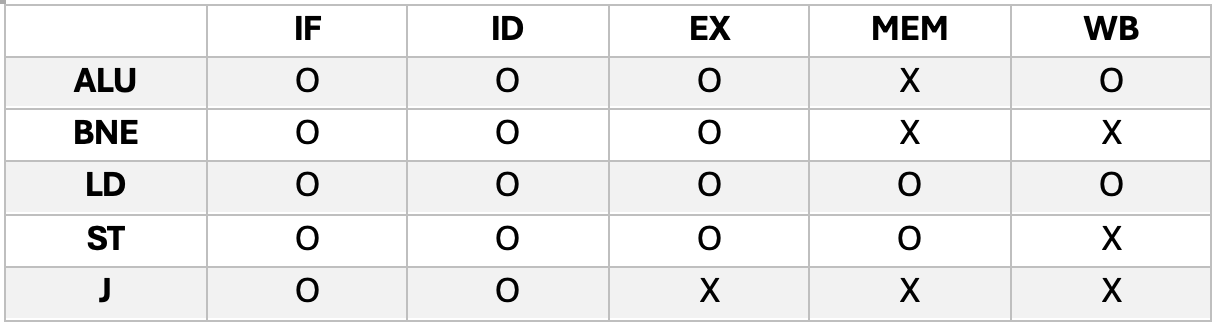 - 설명: 두 레지스터의 값을 비교하고(ID/EX), 점프할 타겟 주소를 계산하기 위해 EX 단계까지는 ALU를 사용합니다(O). 하지만 메모리에서 데이터를 가져올 일도 없고(MEM X), 계산 결과를 레지스터에 덮어쓸 일도 없으므로(WB X) 뒤의 두 단계는 사용하지 않습니다.
