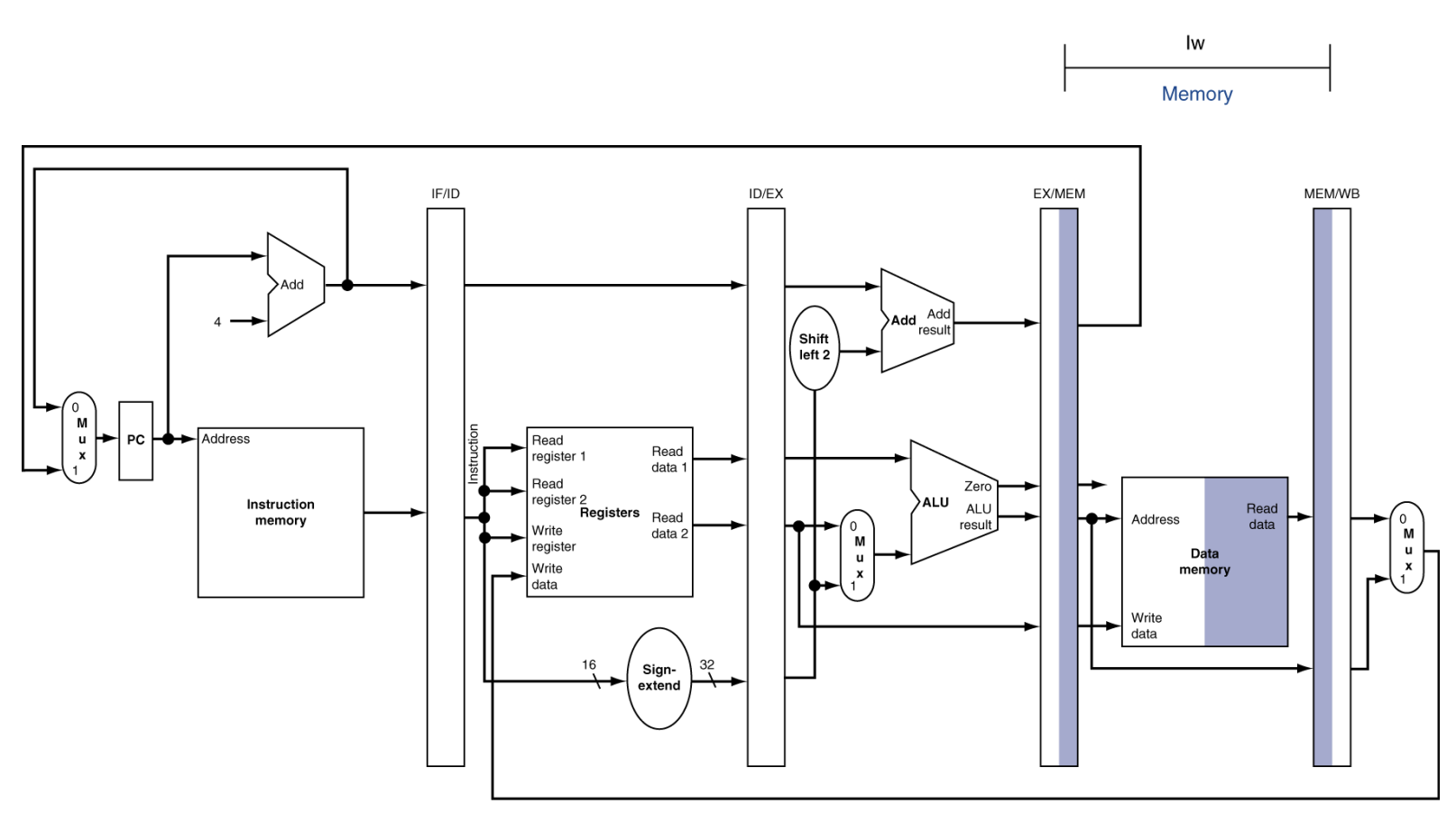 - 설명: 유일하게 5단계를 모두 꽉 채워서 사용하는 명령어입니다. 주소를 계산하고(EX), 그 주소로 메모리를 찾아가 데이터를 꺼내온 뒤(MEM), 그 데이터를 레지스터에 최종적으로 저장(WB)해야 하기 때문입니다. 이 명령어 때문에 파이프라인 클럭 주기가 5단계로 맞춰지게 됩니다.