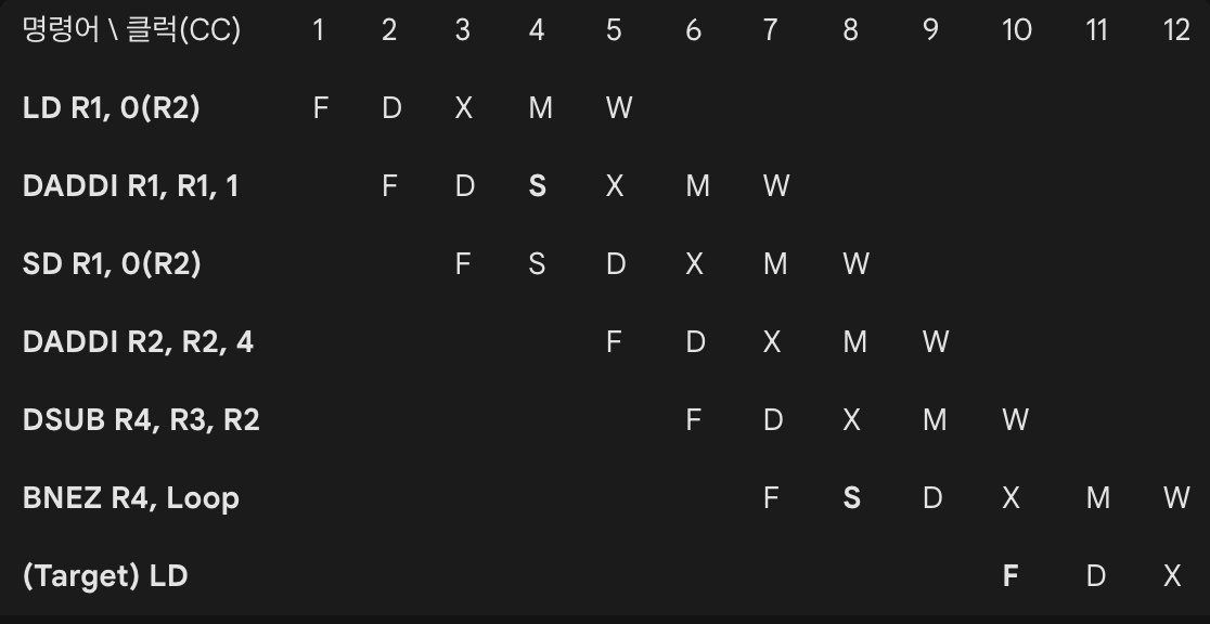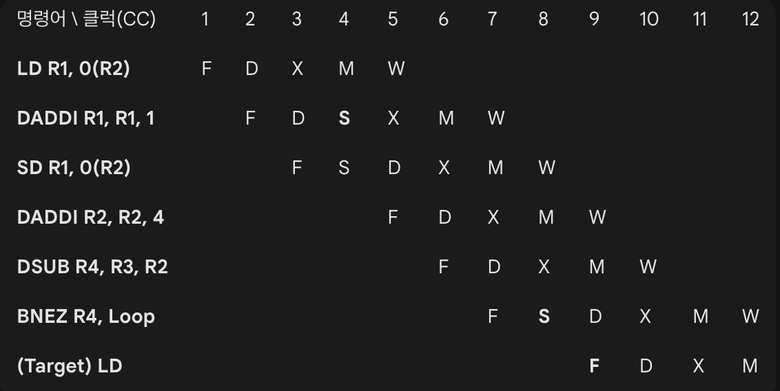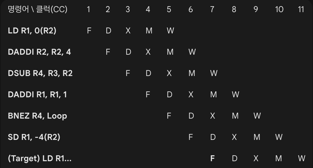 BNEZ R4, Loop // 5. 분기 판단 (DSUB와 떨어져 있어서 스톨 없음)