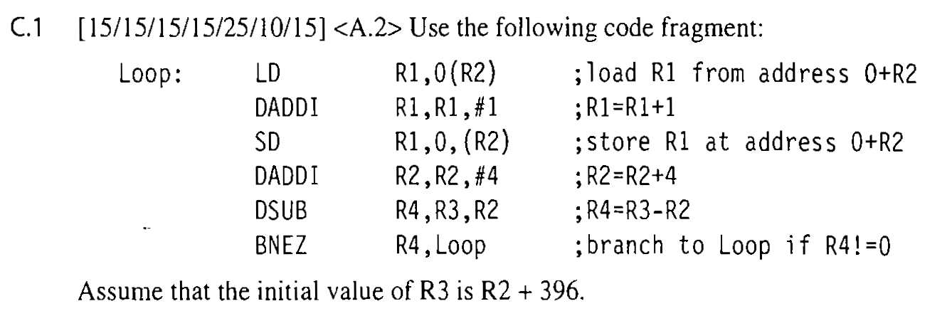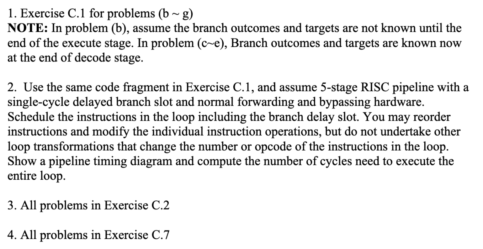 Use the same code fragment in Exercise C.1, and assume 5-stage RISC pipeline with a single-cycle delayed branch slot and normal forwarding and bypassing hardware. Schedule the instructions in the loop including the branch delay slot. You may reorder instructions and modify the individual instruction operations, but do not undertake other loop transformations that change the number or opcode of the instructions in the loop. Show a pipeline timing diagram and compute the number of cycles need to execute the entire loop.