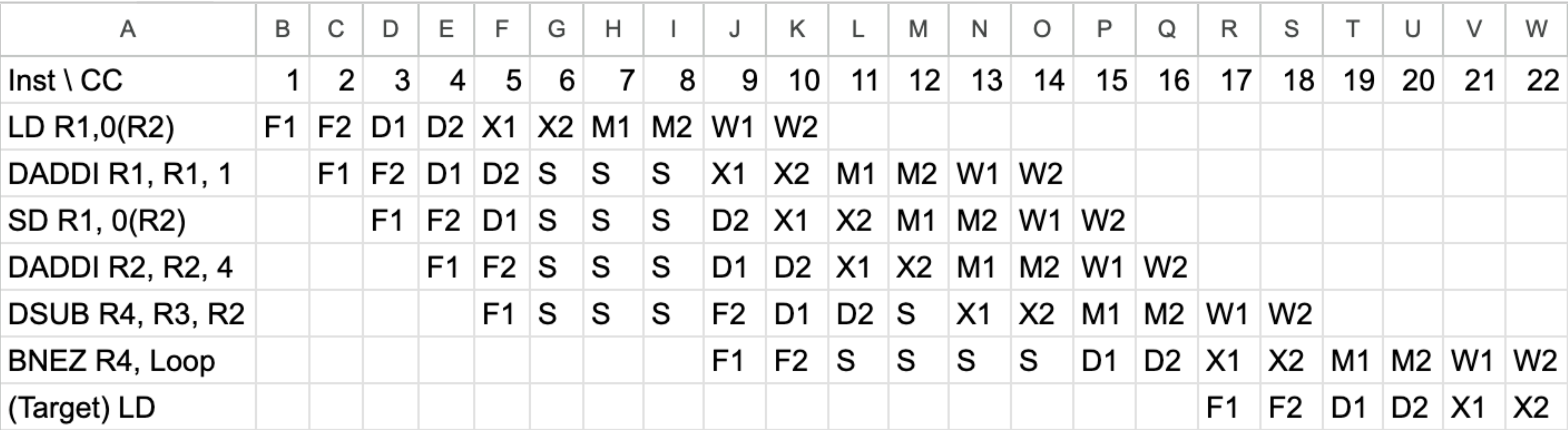 위 표를 보시면 1번째 LD의 F부터 1번째 BNEZ의 W까지 루프 하나가 완전히 끝나는 길이는 12칸입니다.