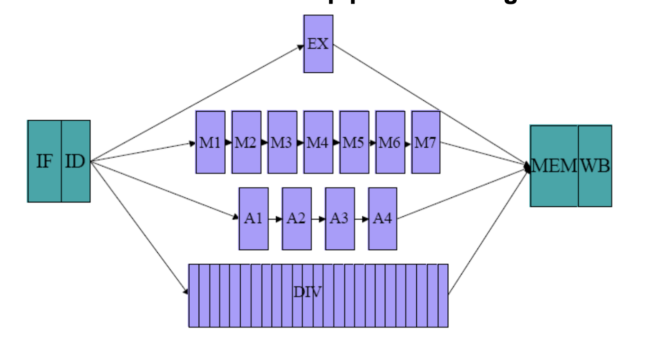 해결책: 파이프라인의 IF와 ID 단계를 공통으로 거친 후, 명령어의 종류에 따라 각기 다른 길(EX Integer, EX FP Adder, EX FP Mult, EX FP Div)로 갈라지는 다차선 도로를 만듭니다.