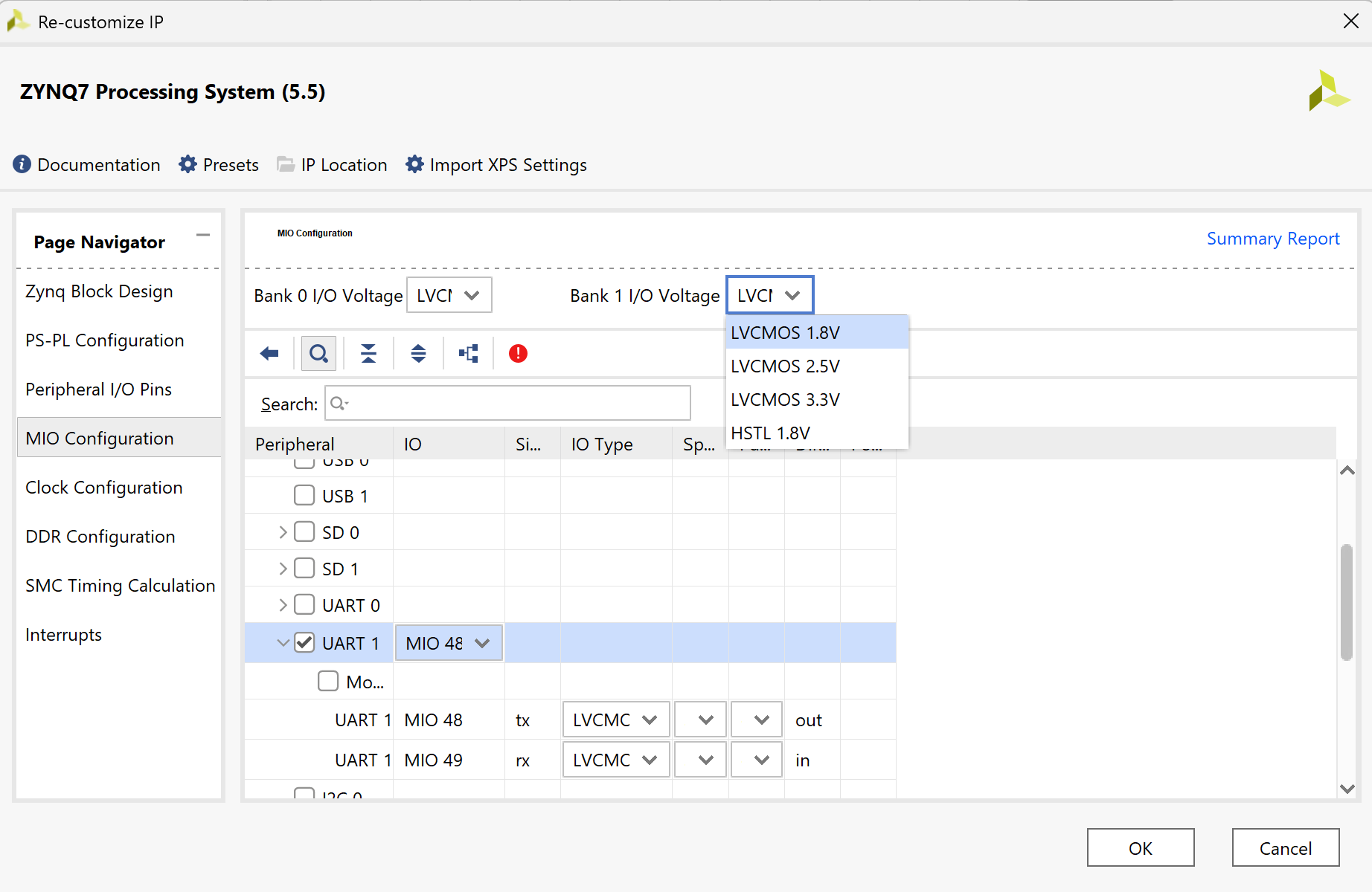UART 1에 체크하고 Bank 1 IO에 LVCMOS 1.8V로 변경해주기