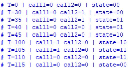 $monitor("T=%0t | call1=%b call2=%b | state=%b",