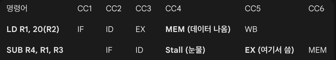 문제점: LD 명령어는 데이터를 MEM 단계가 끝나야 메모리에서 가져옵니다 (CC4 끝). 그런데 SUB는 덧셈을 해야 하니까 EX 단계 시작할 때 데이터가 필요합니다.