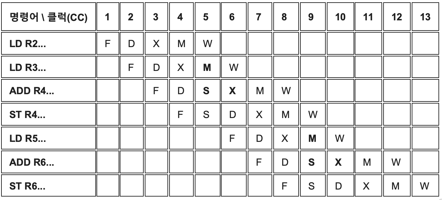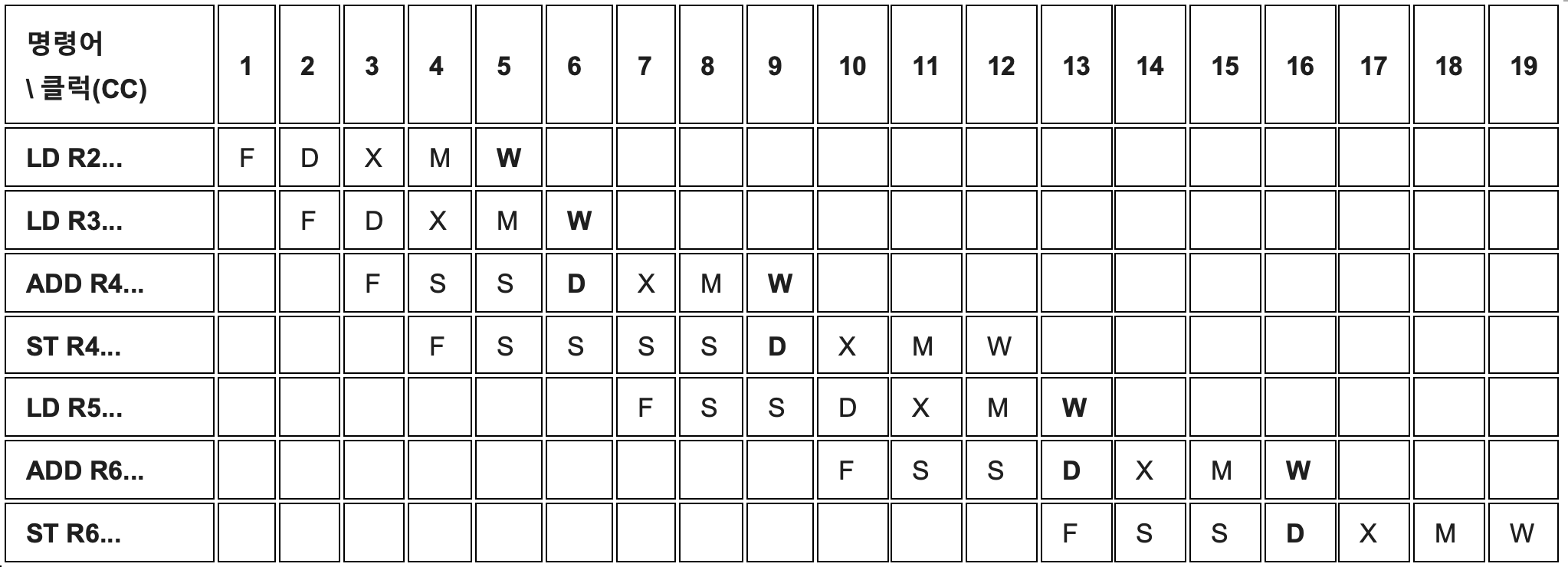 ADD R4 (Load-Use Hazard): 바로 앞 LD R3가 가져오는 데이터를 연산(X)에 써야 합니다. LD는 M 단계(CC5)가 끝나야 데이터가 나오므로, ADD는 어쩔 수 없이 CC5에서 1사이클 쉬고(S), CC6의 X 단계로 포워딩을 받습니다.