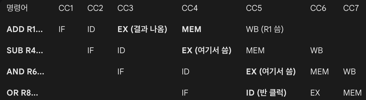 "어차피 ADD의 덧셈 결과는 EX 단계가 끝나면 이미 계산되어 나오잖아? 굳이 WB까지 가서 레지스터에 썼다가 다시 읽어올 필요 없이, 방금 나온 따끈따끈한 결과를 다음 명령어의 ALU 입력으로 직통으로 쏴주자!"