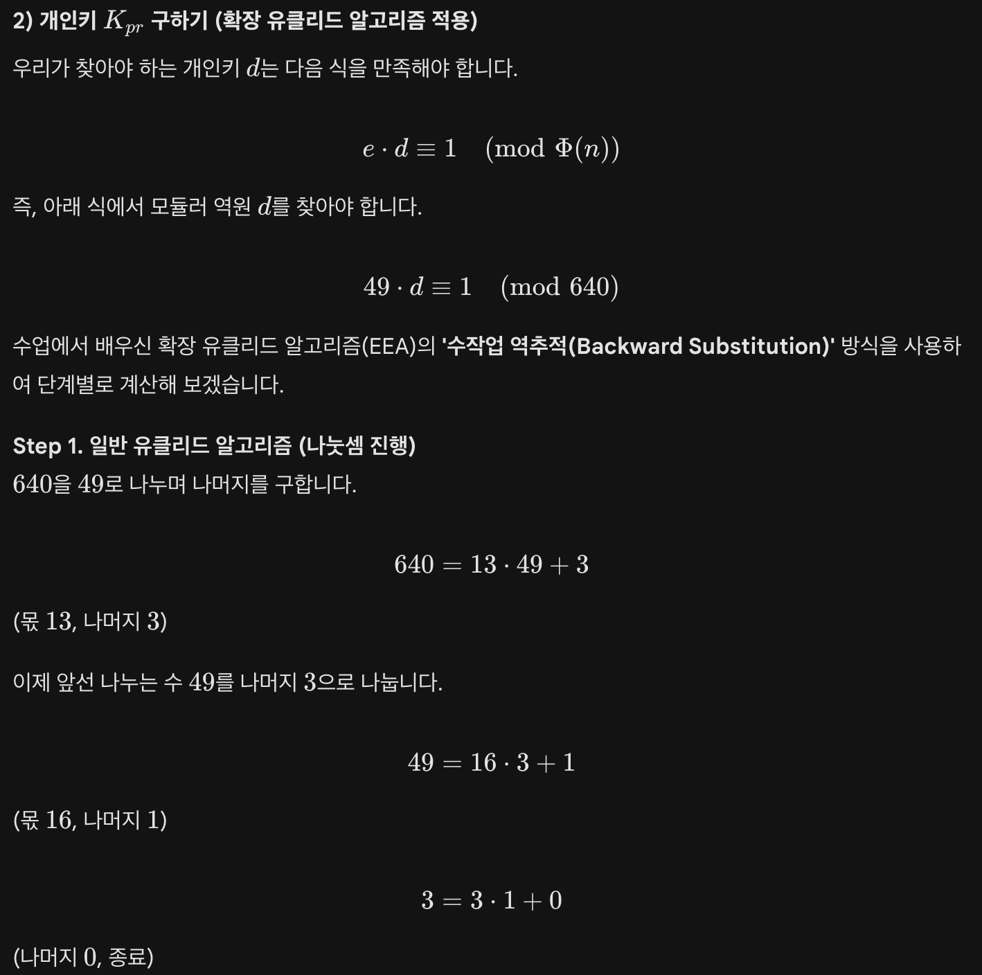 2) Compute the corresponding private key = (p, q, d). Use the extended Euclidean algorithm for the inversion and point out every calculation step.
