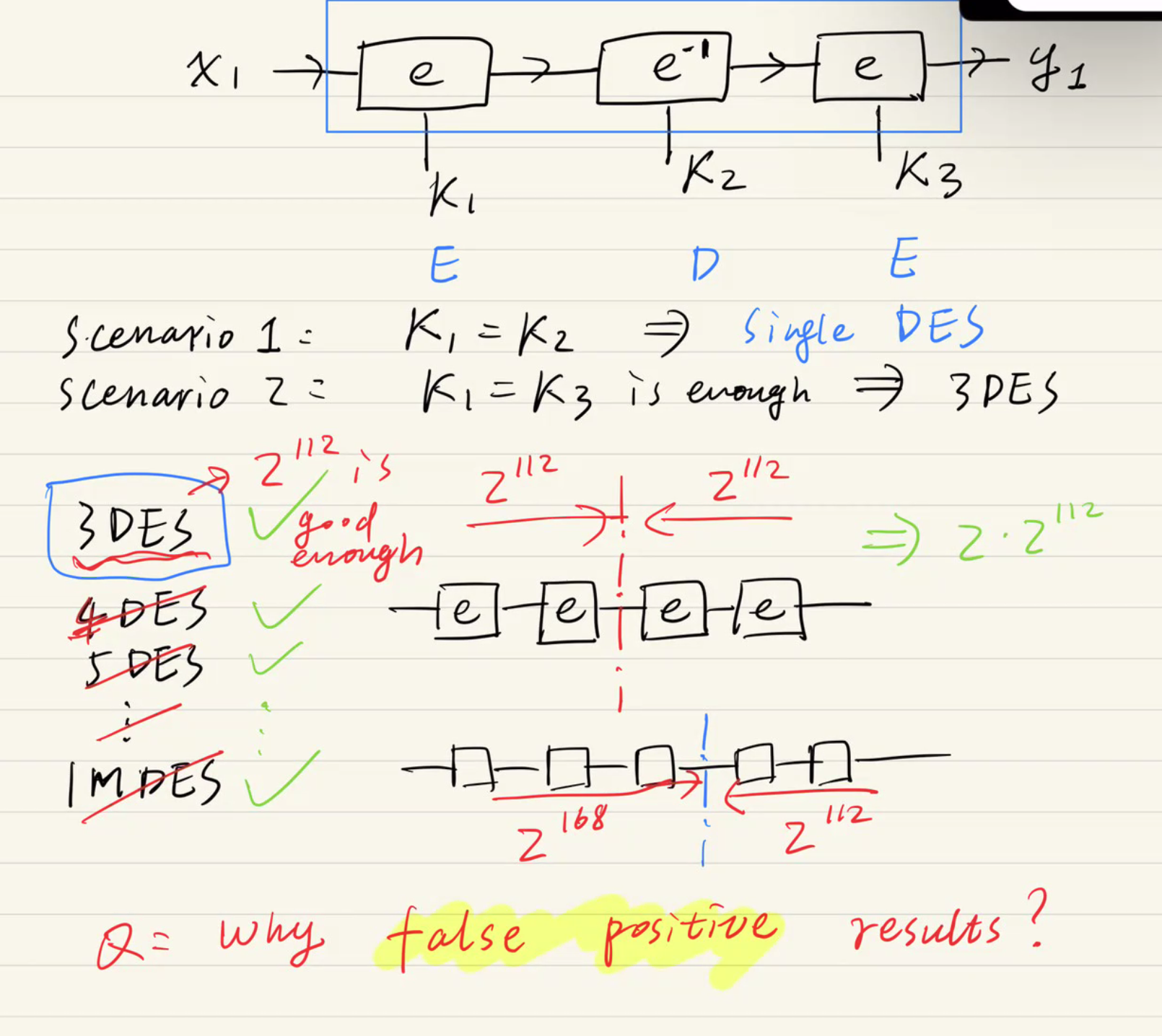Scenario 2 (K1=K3): 3개의 키를 전부 다르게 쓰지 않고, 1번과 3번 키를 똑같이 설정하여 2개의 키만 사용해도(112-bit) 여전히 3DES의 보안성을 유지하기에 충분하다(enough)는 의미입니다.
