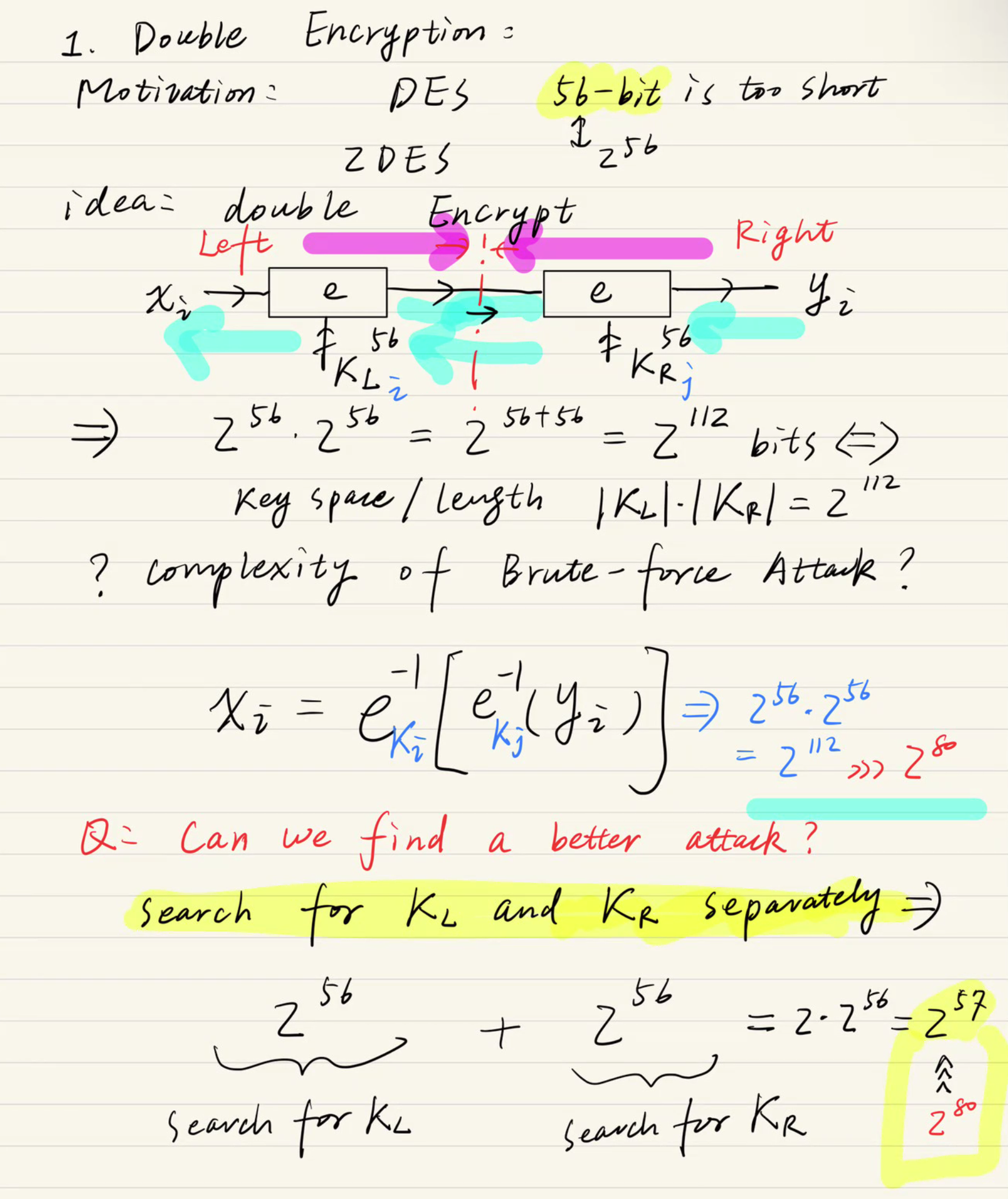 - 기대 효과: 이렇게 하면 키 공간(Key space)의 크기가 ∣KL∣⋅∣KR∣이 되어, 256⋅256=2112 비트 수준의 보안성을 가질 것이라 예상했습니다. 2112는 280보다 훨씬 크기(≫) 때문에 무차별 대입 공격(Brute-force Attack)의 복잡도를 완벽하게 방어할 수 있을 것이라고 생각한 것이죠.