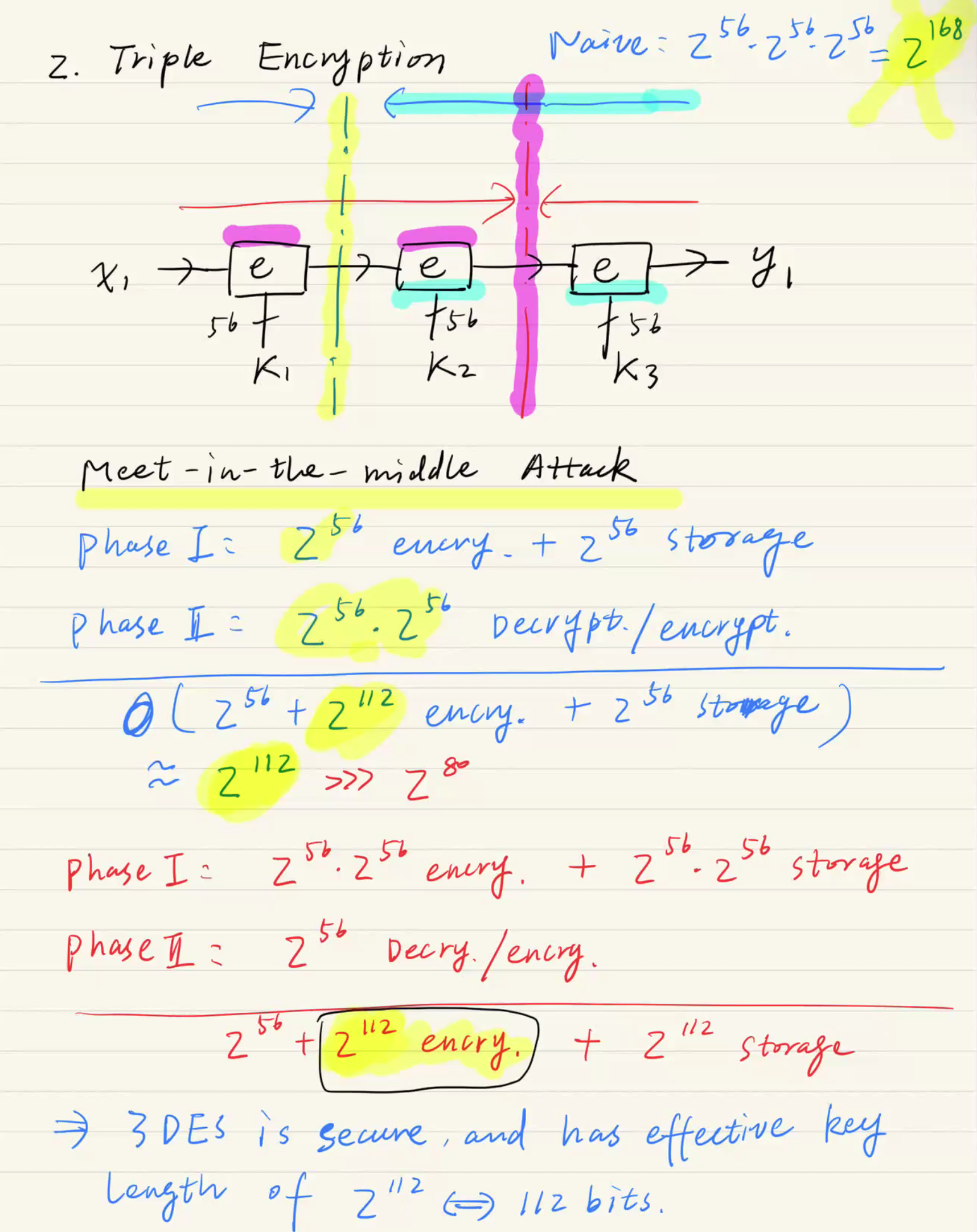 - 사람들은 처음에 56비트 키를 가진 암호화 모듈 3개(K1,K2,K3)를 연달아 이어 붙이면, 보안성이 56+56+56=168비트가 될 것이라고 단순하게(Naive) 생각했습니다.