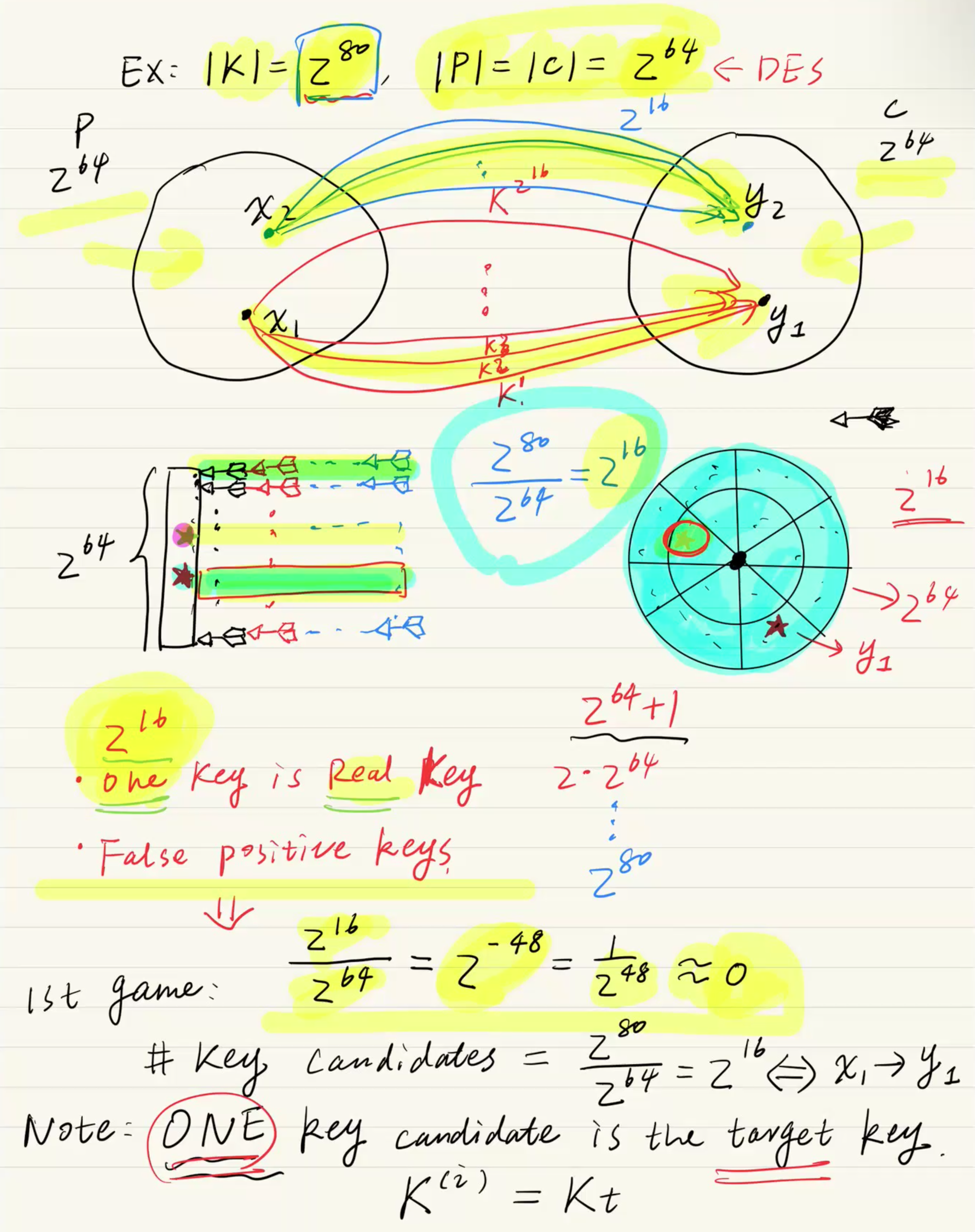 - 해결: 이를 걸러내기 위해, 해커는 사전에 확보해 둔 두 번째 평문-암호문 쌍 (x2,y2)를 꺼내어 방금 찾은 후보 키를 대입해 봅니다.