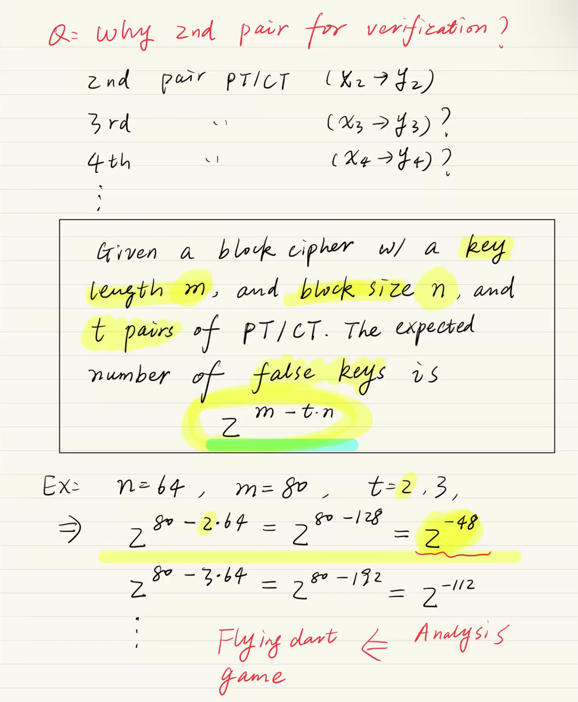 공식: T개의 평문-암호문 쌍(Pairs)이 주어졌을 때, 거짓 양성 키(False Positive Key)가 검증을 통과할 확률 내지 개수는 2^(M - TN) 으로 계산됩니다. (M: 유효 키 길이, N: 블록 크기, T: 쌍의 개수)