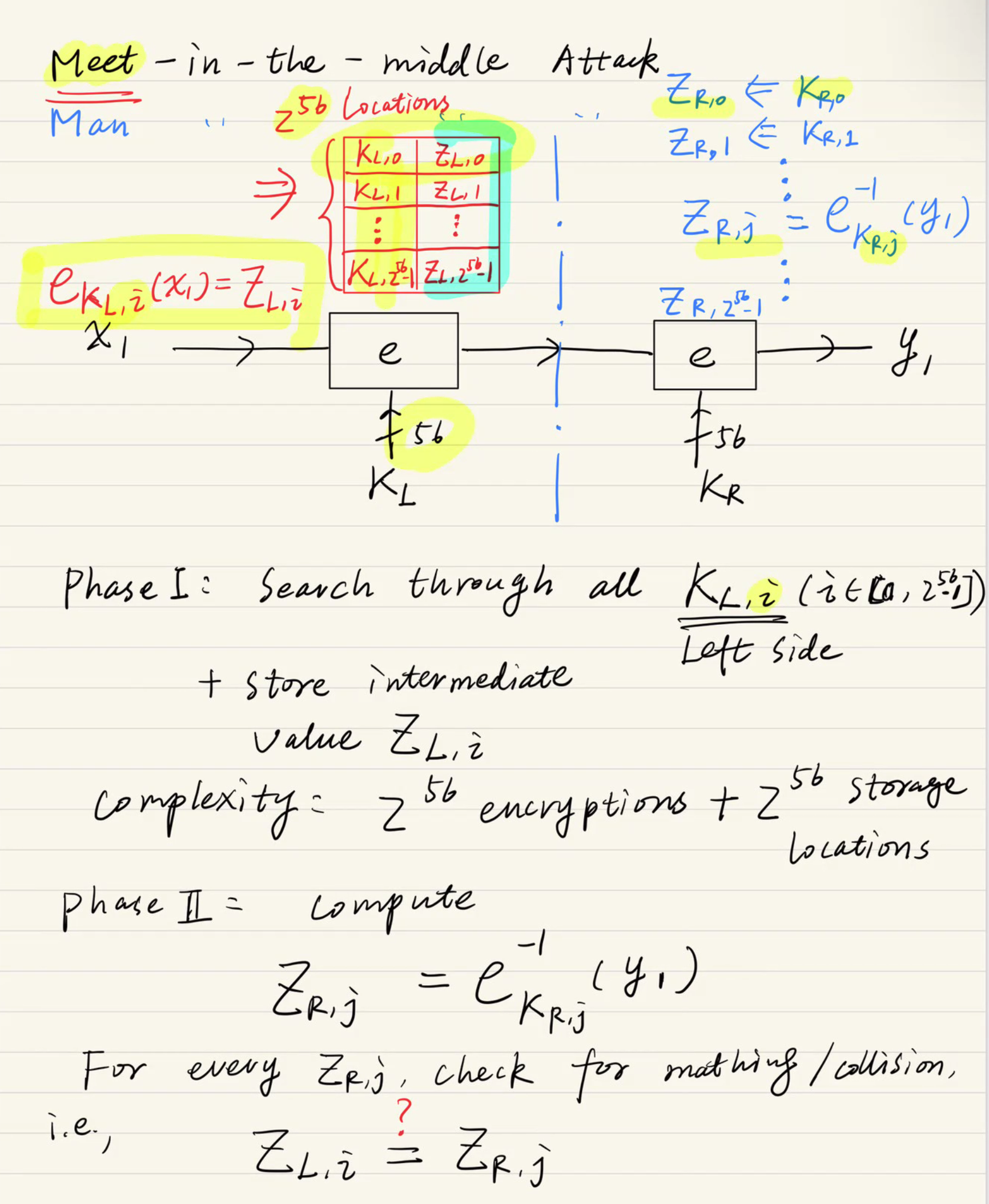 암호화 연산: 해커는 알고 있는 평문 x1을 256개의 모든 가능한 왼쪽 키 KL,i (i는 0부터 256−1까지)를 이용해 암호화 모듈(e)에 통과시킵니다.