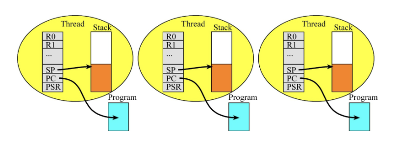 가장 중요한 특징: 각 스레드는 자신만의 CPU 상태(PC, R0~R15)와 고유한 스택(Stack) 공간을 독립적으로 가집니다.