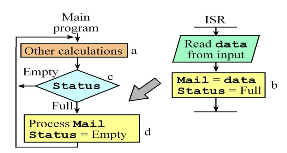요약하자면: 이 그림은 "ISR이 편지(Data)를 넣고 깃발(Status)을 올리면, 메인 프로그램이 깃발을 보고 편지를 꺼내가는 과정"을 도식화한 것입니다.